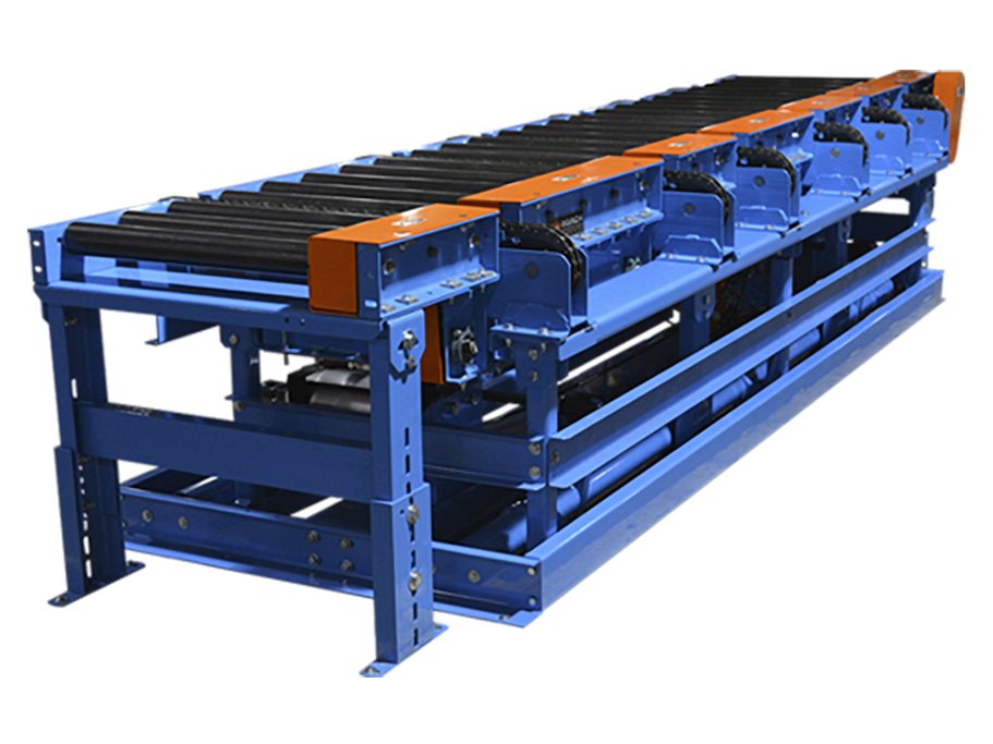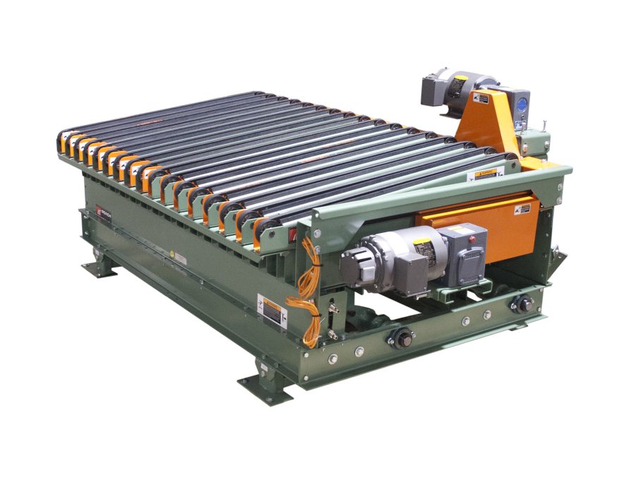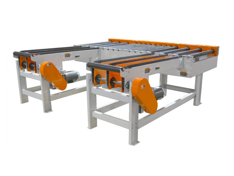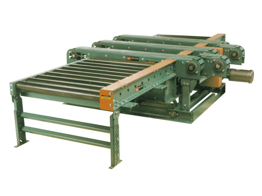 This specialty transfer conveyor transfers products at 90-degrees. The transfer is mounted below the top of the conveyor roller and is raised pneumatically to move the strands above the top of chain guard to transfer product 90 degrees. The transfer is reversible and includes a driven relief section to bridge the transition to chain conveyor, which provides the conveyed product a smooth transition.