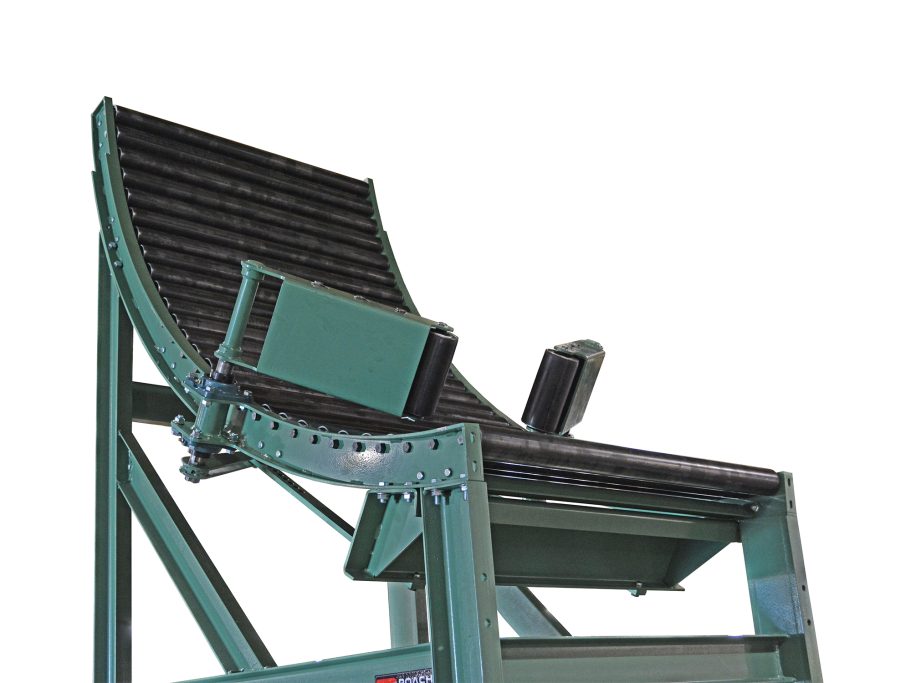 The vertical roller tire chute is constructed of 251S rollers mounted in a structural steel curved frame with a tire centering device. The centering device is adjustable in 1 inch increments to accommodate multiple size tires on the conveyor line as they pass through. A special support base was designed to distribute the shock loading as tires are dropped onto the conveyor.