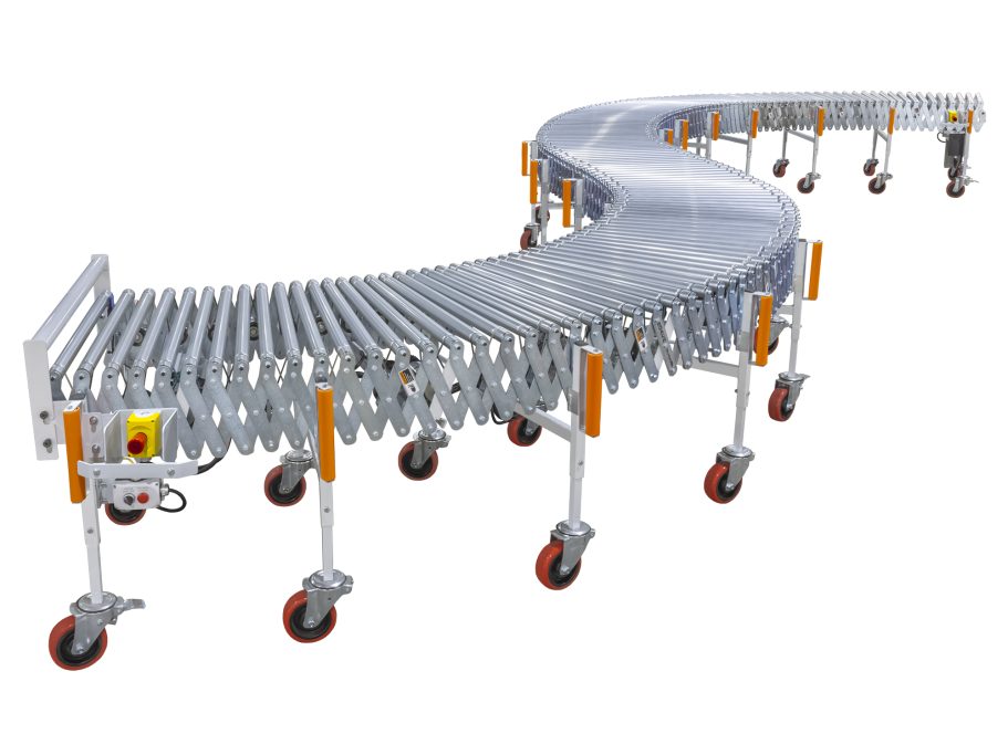 The PowerFlex conveyor is a powered flexible roller conveyor built for situations where gravity alone is impractical and fixed powered conveyors cannot be easily deployed. Powered 1.5-inch grooved rollers driven through an accordion-style flexible frame provide controlled movement and accurate tracking along curves and extended lengths, making it suitable for dynamic shipping, staging, or flow paths. Standard conveying surface width is 30 inches with roughly 100 pounds per foot capacity and modular linking options for extended layouts.