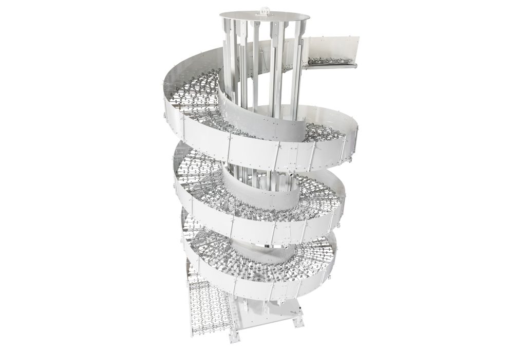 The Gravity Spiral Conveyor provides a practical method for moving products between elevations while minimizing floor space requirements. Product movement is driven entirely by gravity, allowing cartons, totes, and packages to flow smoothly and consistently without electrical power. The spiral configuration supports continuous vertical transfer and integrates easily with straight or curved gravity conveyor sections.
