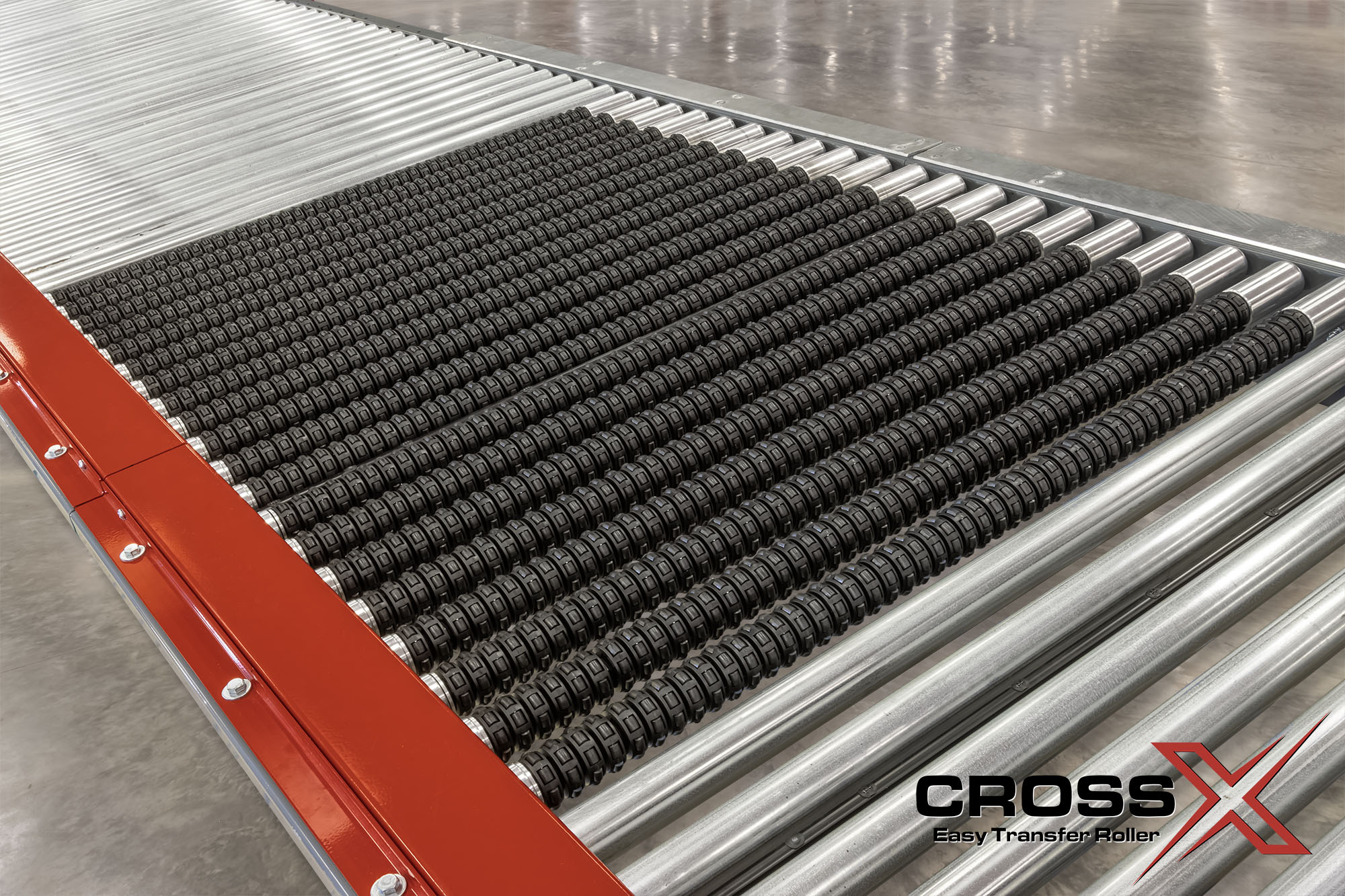 The CrossX™ Easy Transfer Roller converts a standard roller conveyor section into a transverse top push configuration quickly and cost-effectively, delivering the functionality of a transverse roller top belt conveyor without the higher investment.